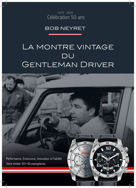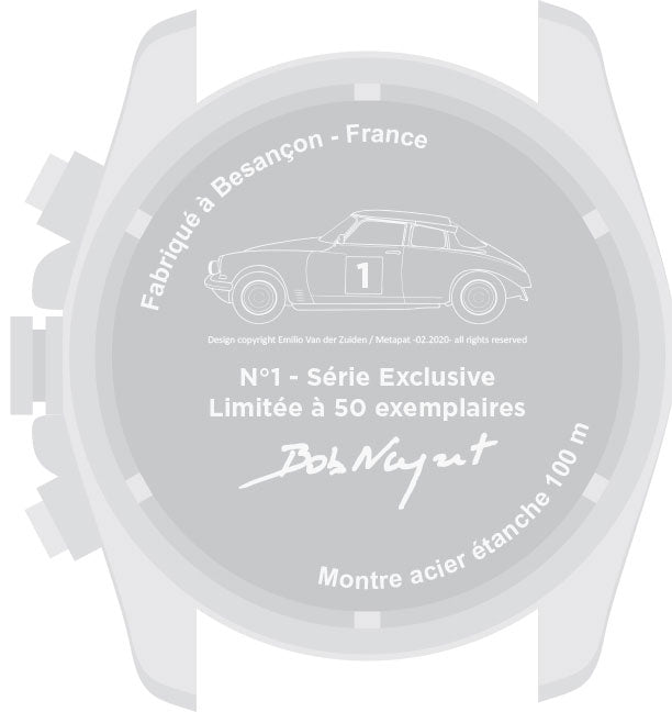 “Bob Neyret” Chronograph Watch. Produced in a limited series of 50 finely numbered copies on the door of the replica of the DS Coupé (Model of Victory at the 1970 Morocco Rally) engraved on the back of the watch. Last copies available!