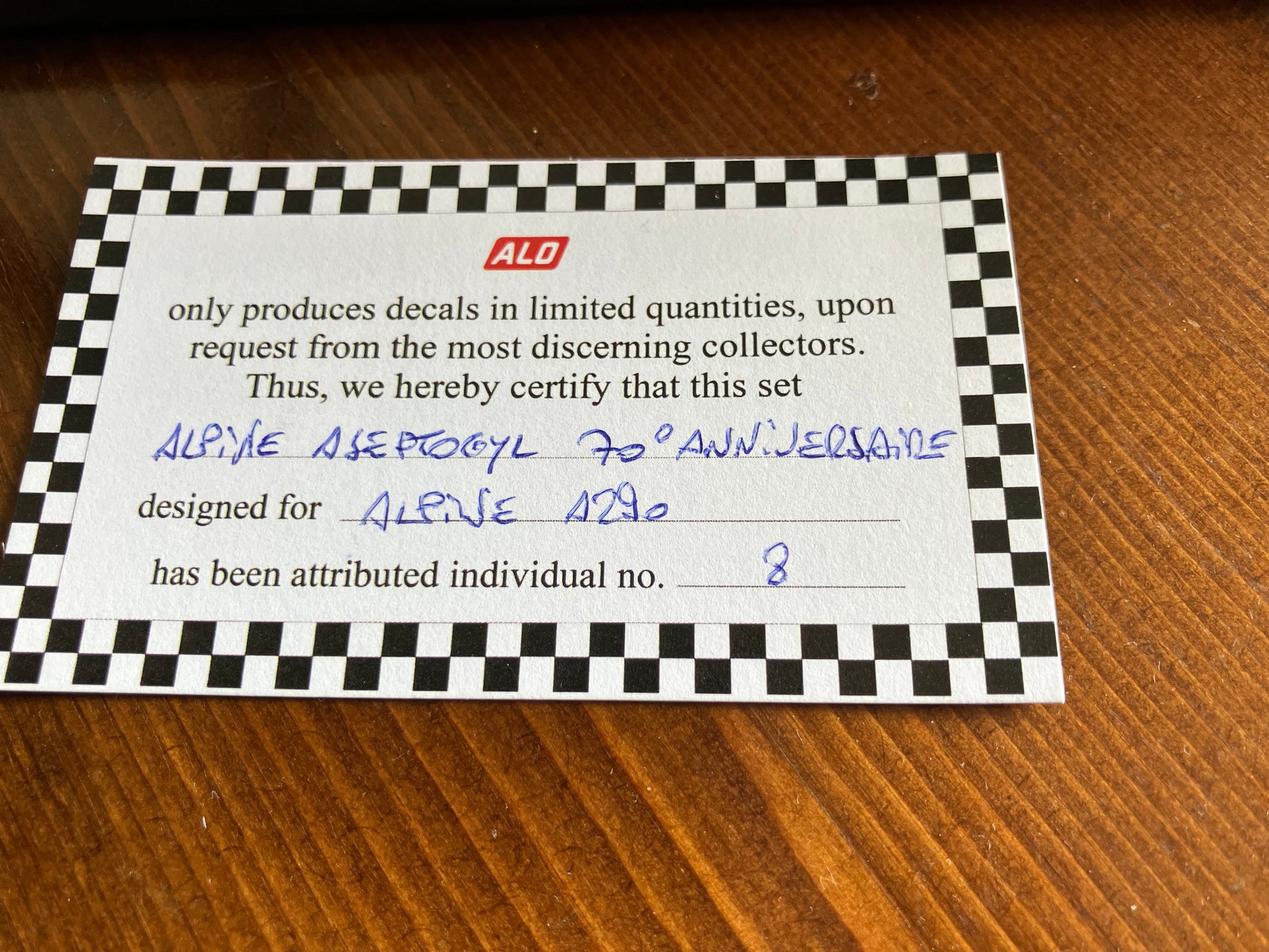 Le lot comporte le "Alpine 70 ans" soit en BLANC (décal latéral) soit en NOIR, pour une customisation maximale. Il n'y a PLUS de décals en NOIR