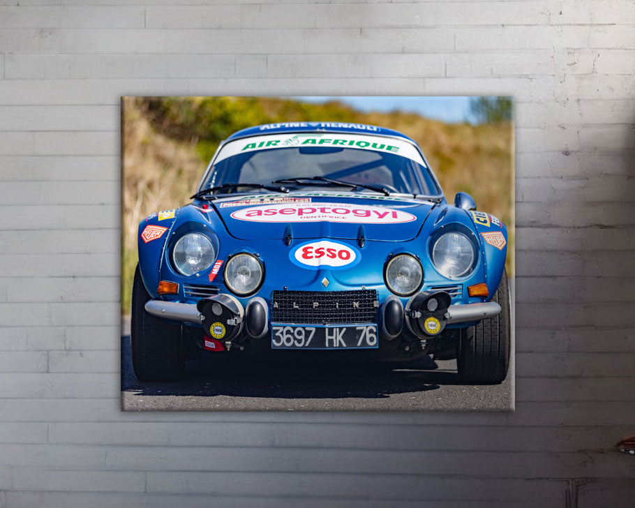 Toile impression HD - Alpine A110 Berlinette "mulet usine 1973" identique aux fameuses du championnat du Monde 1973 - parcours impressionnant (Ecurie ECI - Bob Neyret - JC Bertrand).