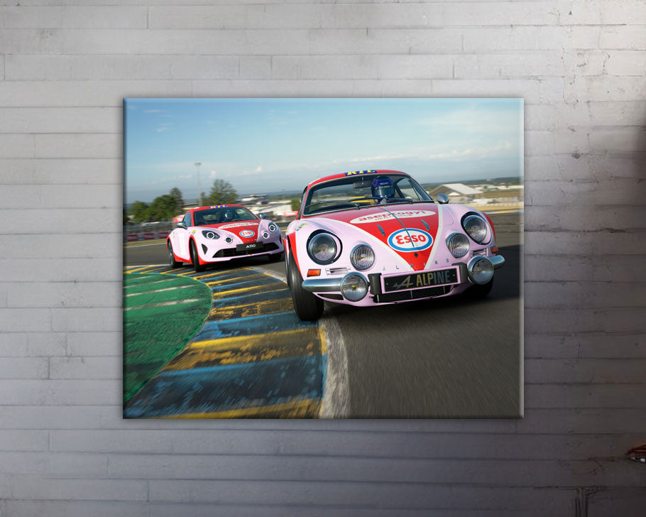 Toile impression HD - réalisation digitale originale exclusive mettant en scène l'Alpine Berlinette originale Aseptogyl (1971) et sa descendante A110 Alpine "moderne" aux couleurs Aseptogyl , sur le mythique tracé du Mans.